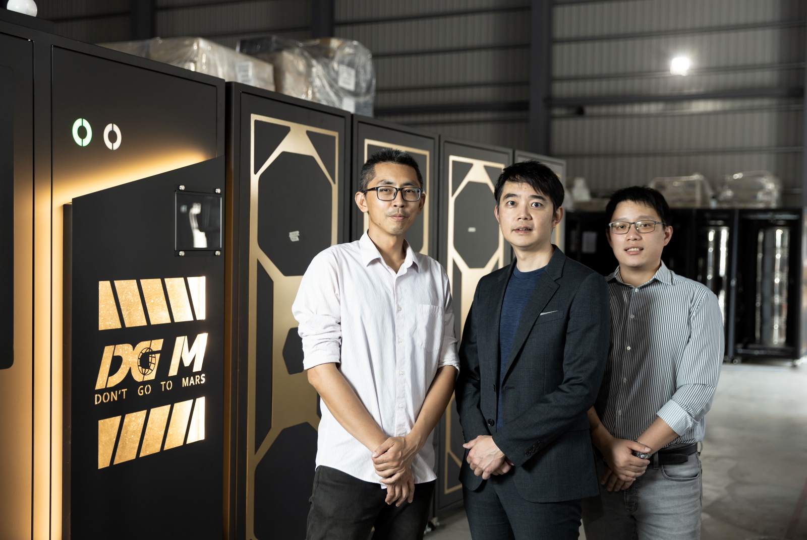 永瑞董事長林修安(中)把夜市廢油變乾淨原料,還以DGM為品牌,開發智能回收機台,背後意思是地球只有一個,因此「別去火星(Don't Go to Mars)」。圖左為研發長吳侑峻、右為財務長鄭力維。圖片來源:楊雅晴攝